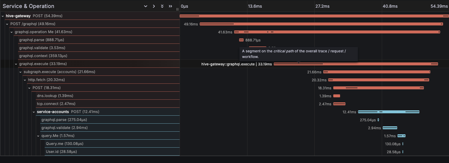 Hive Gateway’s integration brings comprehensive monitoring capabilities to your GraphQL infrastructure. By providing detailed traces, metrics, and logs with unified context, it helps you identify and resolve issues faster, whether they’re in the gateway, subgraphs, or the communication between them.